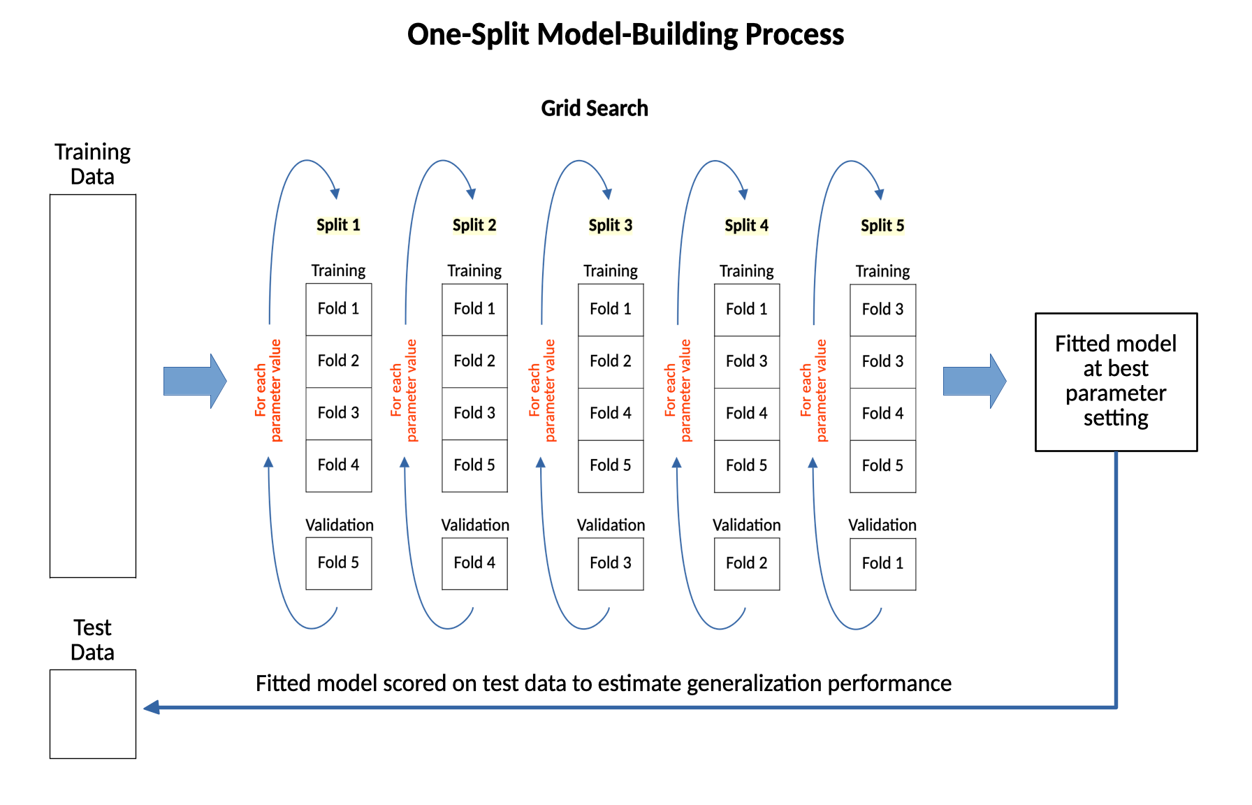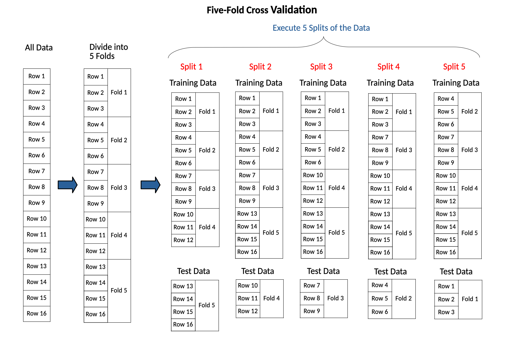 For example, to implement 5-fold cross validation you would first divide the data into 5 folds, then do 5 splits. Each of the 5 folds serves as the test data for one of the splits, with the other folds serving as the training data for that split. The diagram below demonstrates 5-fold cross validation.