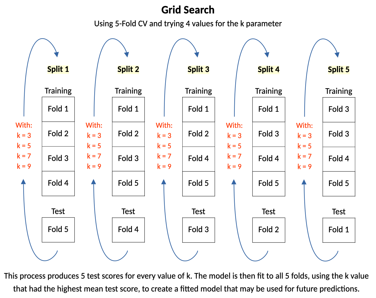 K-fold cross validation is the default form of cross validation used by scikit-learn’s cross_validate() function (used to estimate generalization performance) and GridSearchCV() function (used for model tuning with grid search, which we will see in a later section of this chapter). Those functions use K-fold cross validation when the target is numeric and stratified K-fold cross validation when the target is categorical. The term stratified means that when the data is divided into folds the function attempts to keep the ratio of values of the target class the same in each fold. For example, if we are building a model to predict whether a cell is cancerous or not and 45% of the rows overall are cancerous, the splitting procedure for stratified K-fold cross validation attempts to split the data so that the percentage of cancerous rows in each fold is as close to 45% as possible.