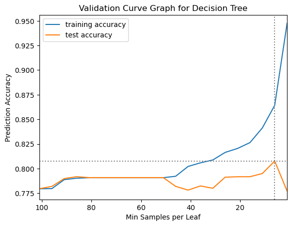 Let’s run through the full model-building process for the decision tree algorithm on the Titanic data, tuning the min_samples_leaf parameter: