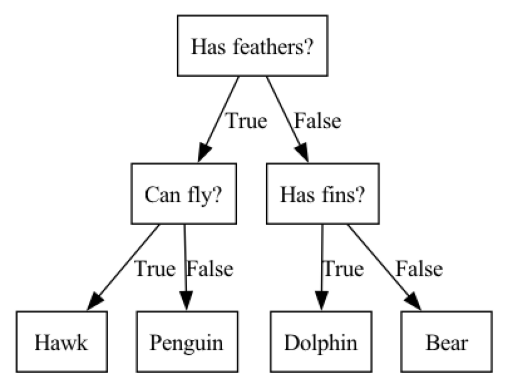 A decision tree is a hierarchy of if/else questions, leading to a decision. For example, consider a classification task in which we are trying to classify animals as various species depending on their characteristics, such as if they have feathers, if they can fly, and if they have fins. the decision tree shown below could be used to do the classification. We start at the top of the tree and ask questions as we go down. After each question the data is split into two directions, based on the answer to the question. Each instance in the data will end up at one leaf at the bottom row of the tree, and we can classify the species of that instance based on where it ends up at the bottom of the tree.