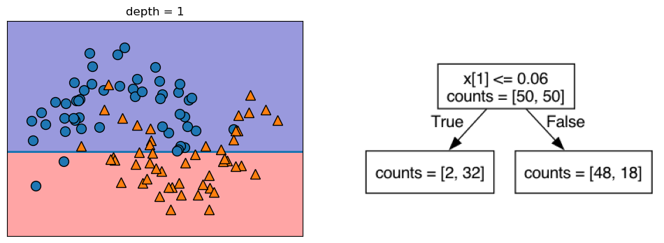 Let’s take a look at some visualizations that show what happens in the first several splits of a tree-building process. We begin by visualizing the data. There are two features, and the target variable has two classes, blue circles and orange triangles. The next few visualizations show the decision boundary created by each split and the current state of the decision tree after each split. Note how adding levels to the tree allows the tree more flexibility to fit the training data. Consider how that will affect generalization performance.